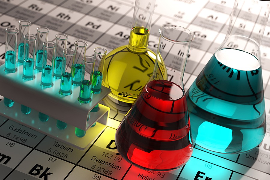 Laboratory test tubes and flasks with colored liquids - Public Service Association