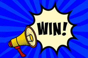 Win announcement speech bubble. Megaphone, speech burst, comic style, bright background, communication element, expression tool, voice projection, information sharing, pop art design. - Public Service Association