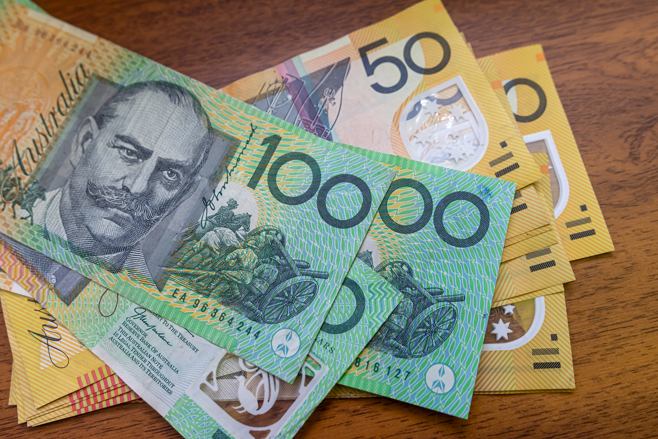 Pay, wages, salary, back pay, pay rise, Aussie currency Australian 50 100 dollar notes. Finance saving concept a